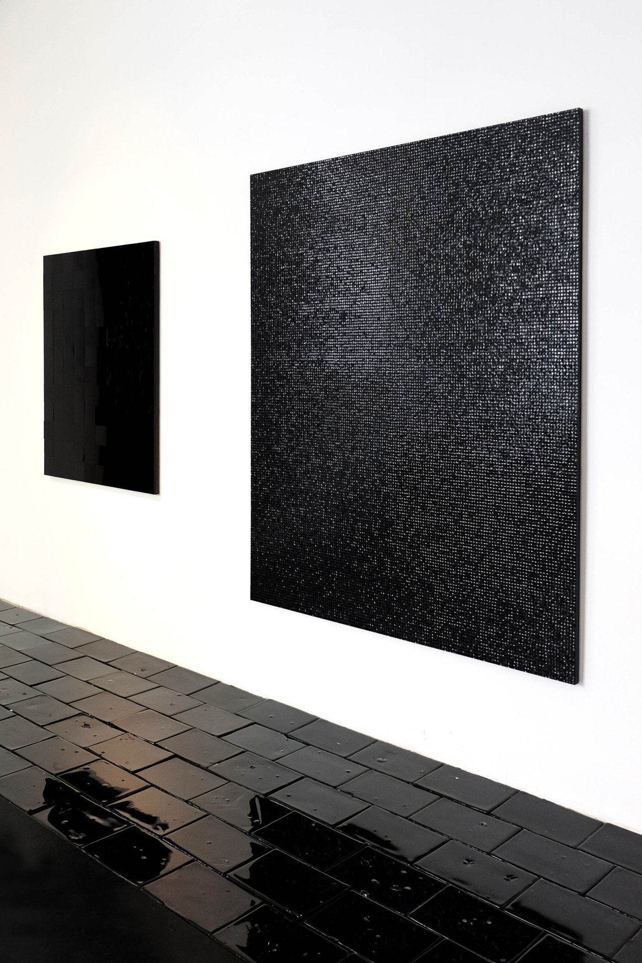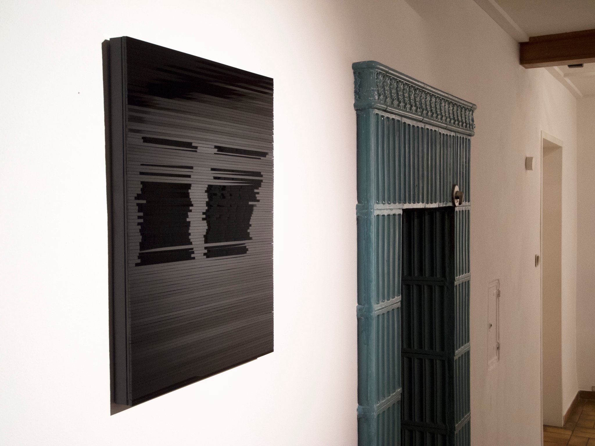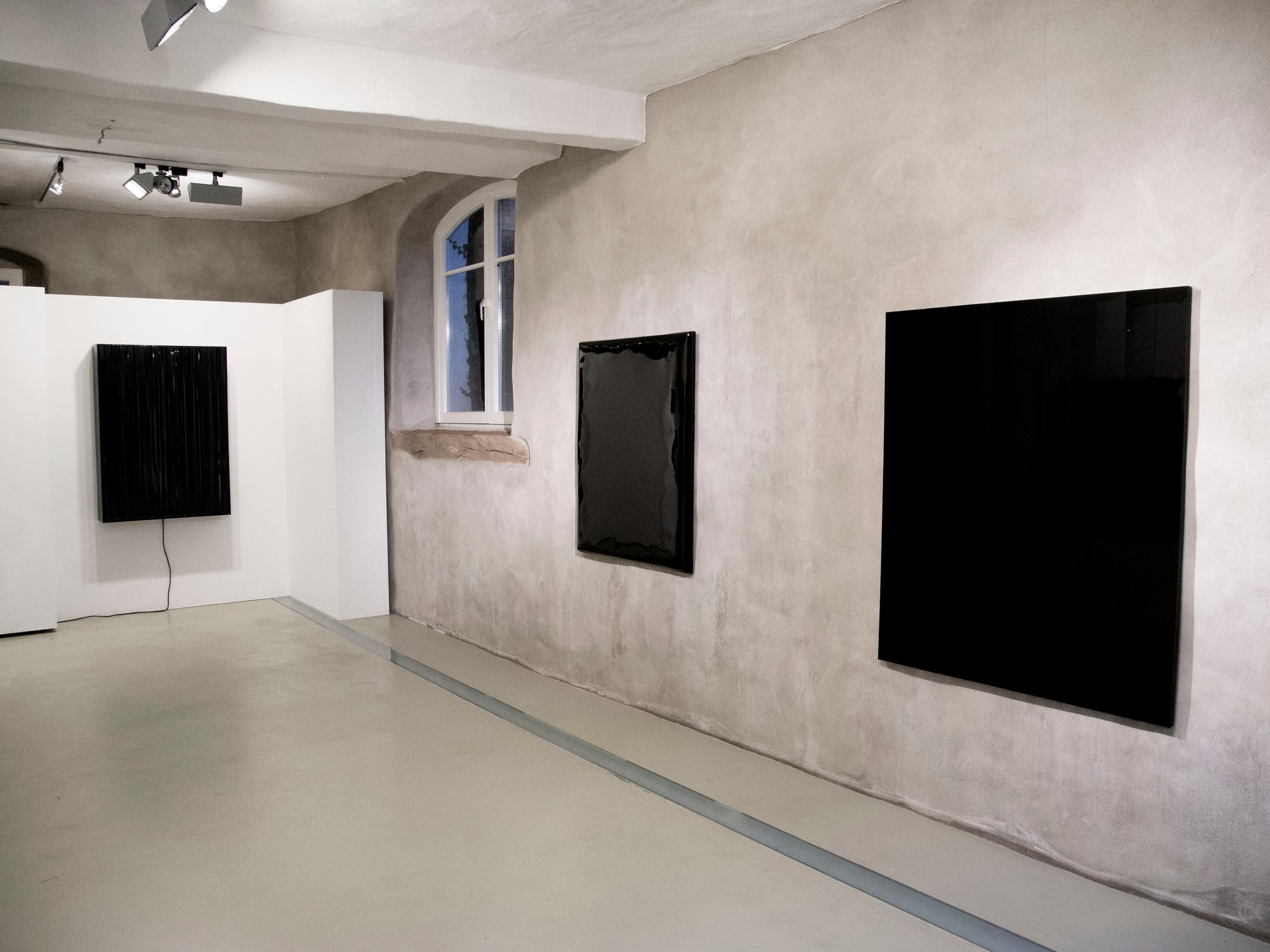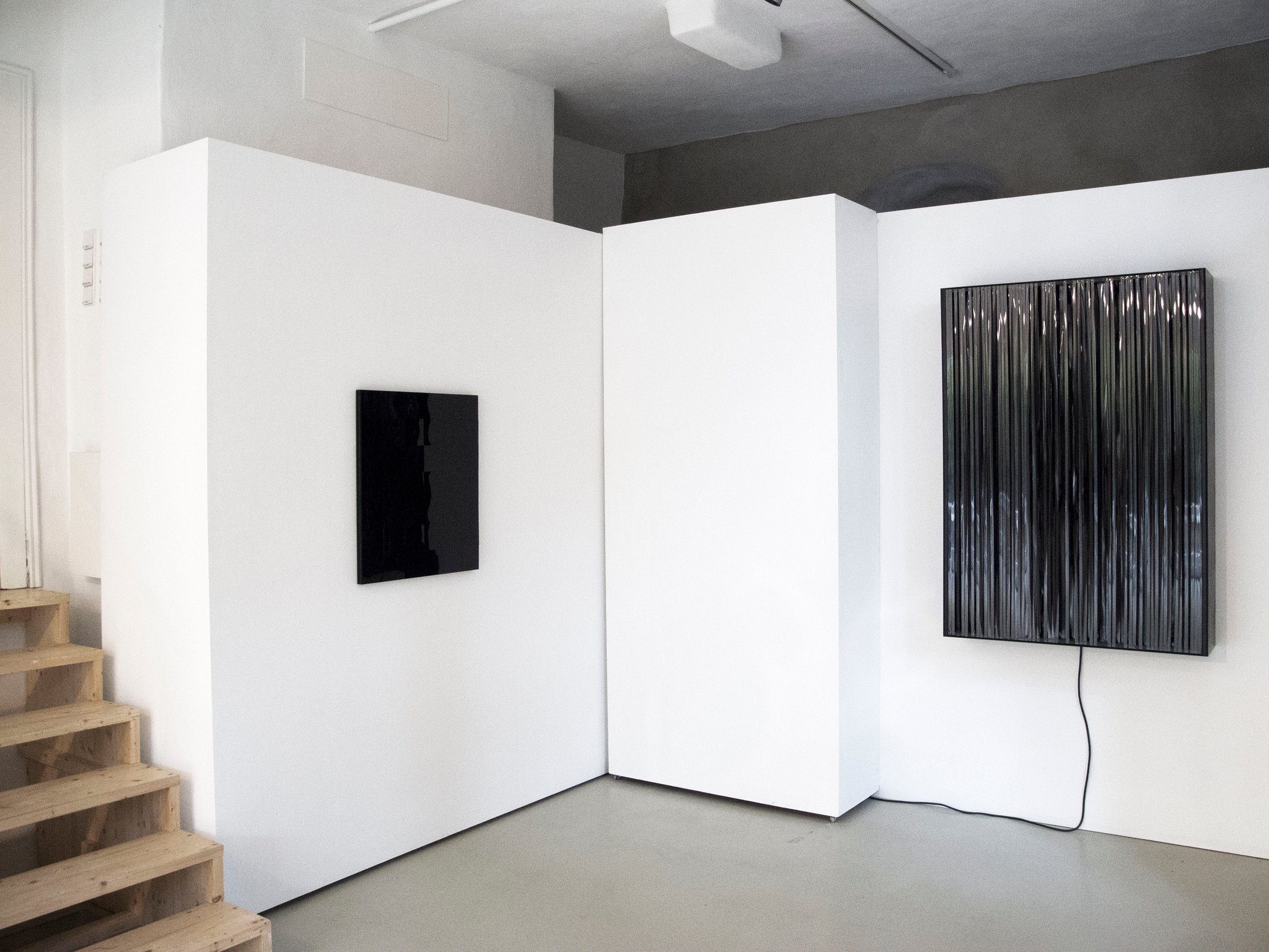 Die erste Einzelausstellung der Künstlerin Julia Schewalie “Shades of Black” gab einen ausgezeichneten Querschnitt ihres bisherigen Schaffens. Ihre Werke kreisen um das Thema Bewegung, Wahrnehmung, Materialität und Rhythmus. In der Verwendung unterschiedlichster Ausgangsmaterialien von Bitumen, Acryl, Vinyl über Autofolien, PVC, Schellack, Nylon bis hin zu Magnetbändern lotet sie die Möglichkeiten der “Materialfarbe” Schwarz konsequent aus.